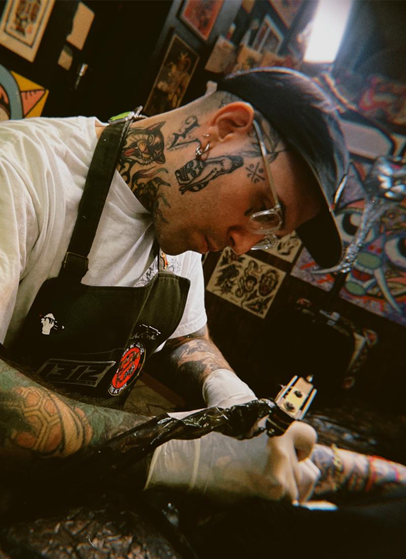 PERLAZONE is a tattoo artist based in Zürich, originally from Buenos Aires, Argentina. With over 11 years of experience, he began his tattoo journey in 2014 after an apprenticeship in Buenos Aires. His art is deeply influenced by his background in graffiti and hardcore punk culture, creating a unique fusion of traditional tattoo style and street art.