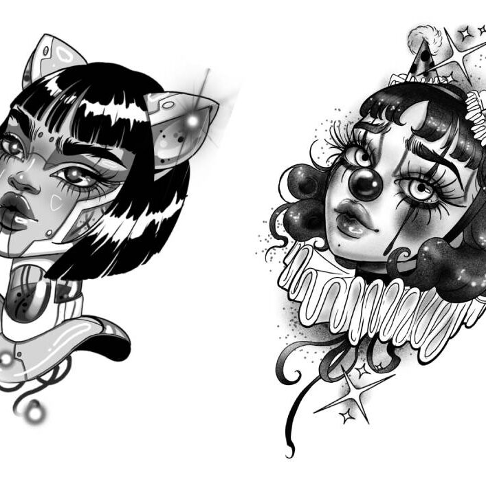 Her creativity extends beyond realism into vibrant colour tattoos and illustrative designs. Inspired by fantasy, 80s–90s comics, and anime with artistic influences from Luis Royo, H. R. Giger, and Boris Vallejo.
