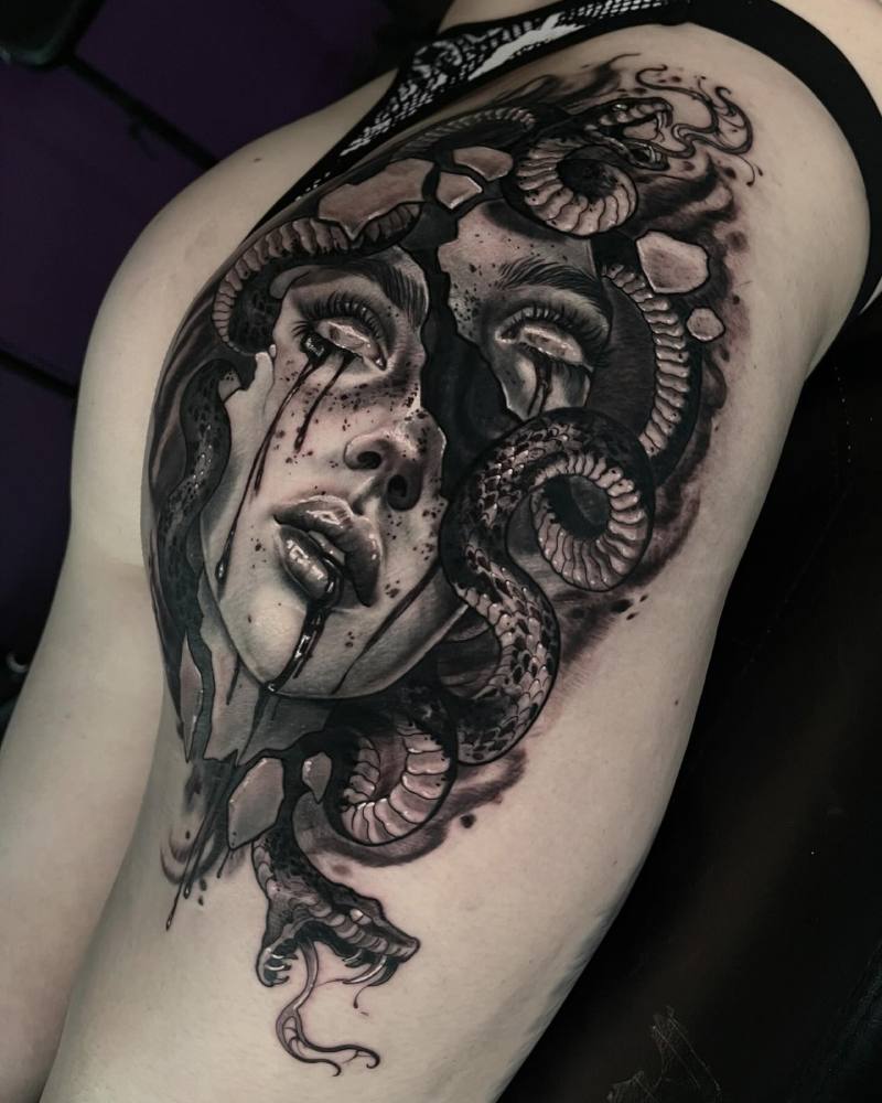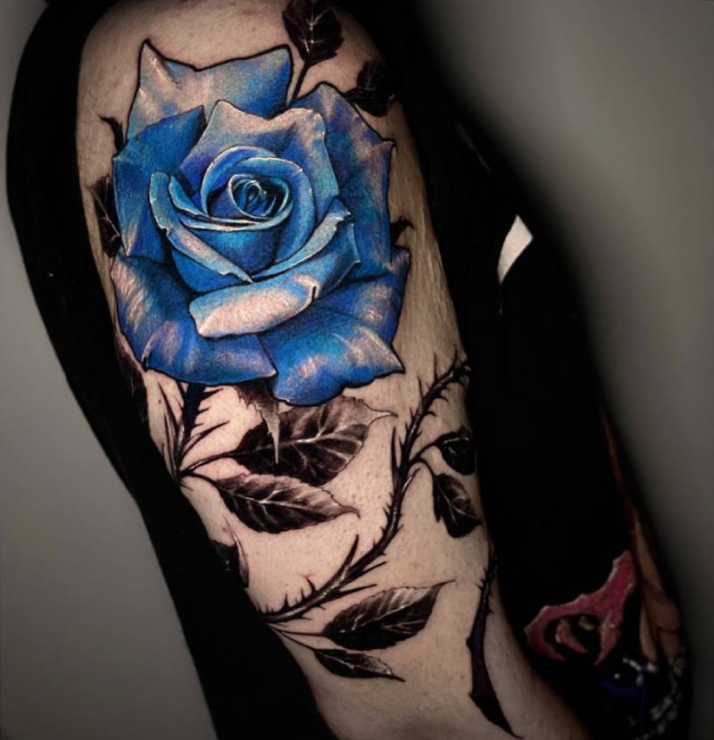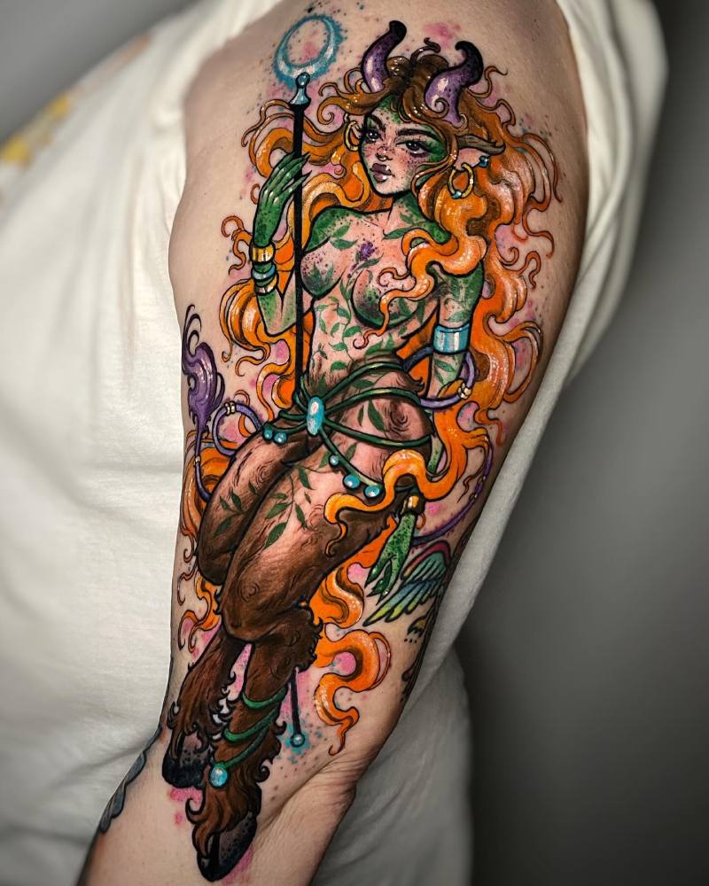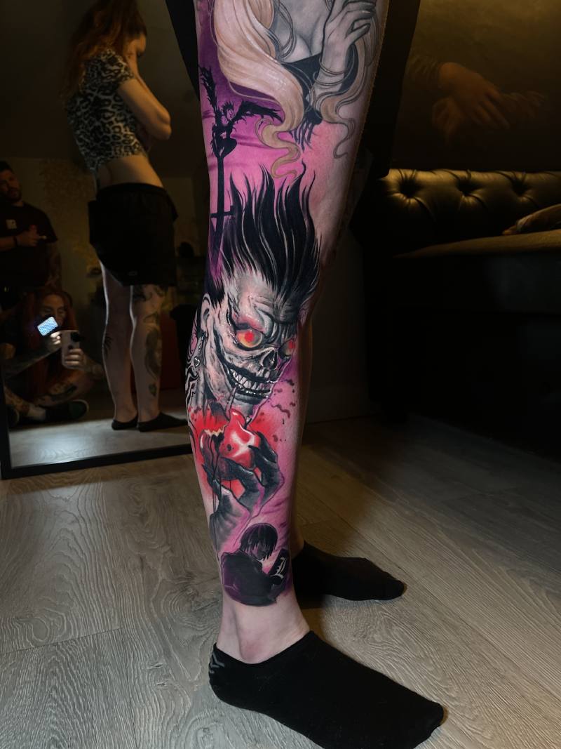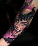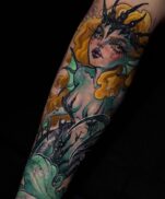 Her creativity extends beyond realism into vibrant colour tattoos and illustrative designs. Inspired by fantasy, 80s–90s comics, and anime with artistic influences from Luis Royo, H. R. Giger, and Boris Vallejo.