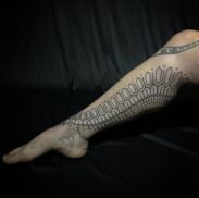 For seven years, I lived in Mexico, where I had the honor of working alongside very inspiring tattoo artists. Living there strongly influenced my work through my interest in pre-Hispanic history, Indigenous cultures, archeological sites, folk art, and ancient traditions. My tattoos and paintings reflect my interpretation of these studies and visions. In my tattoo practice, I aim to respect the natural flow of the body, which is why most of my work is created freehand.
