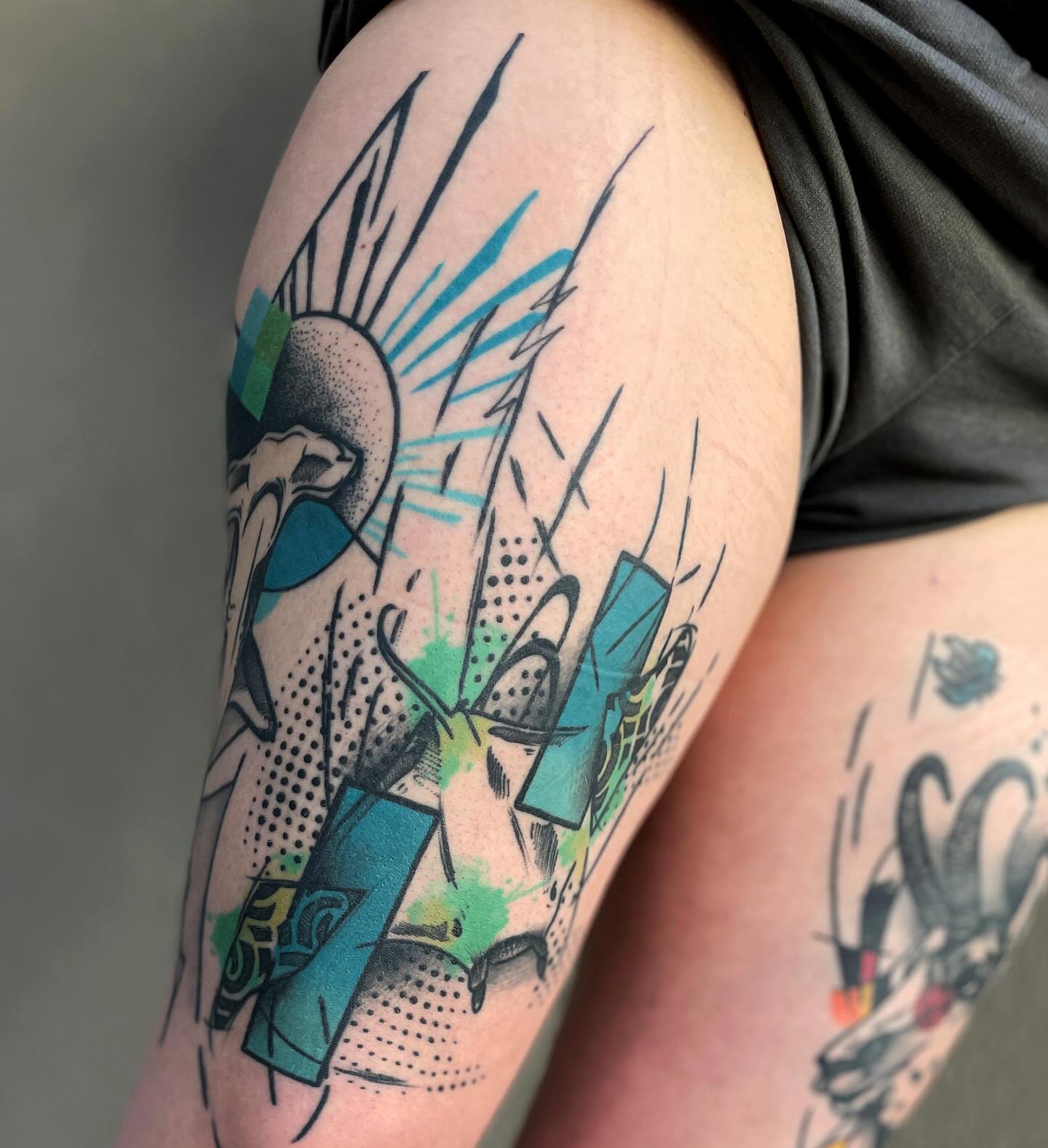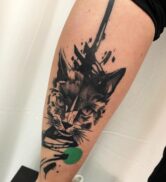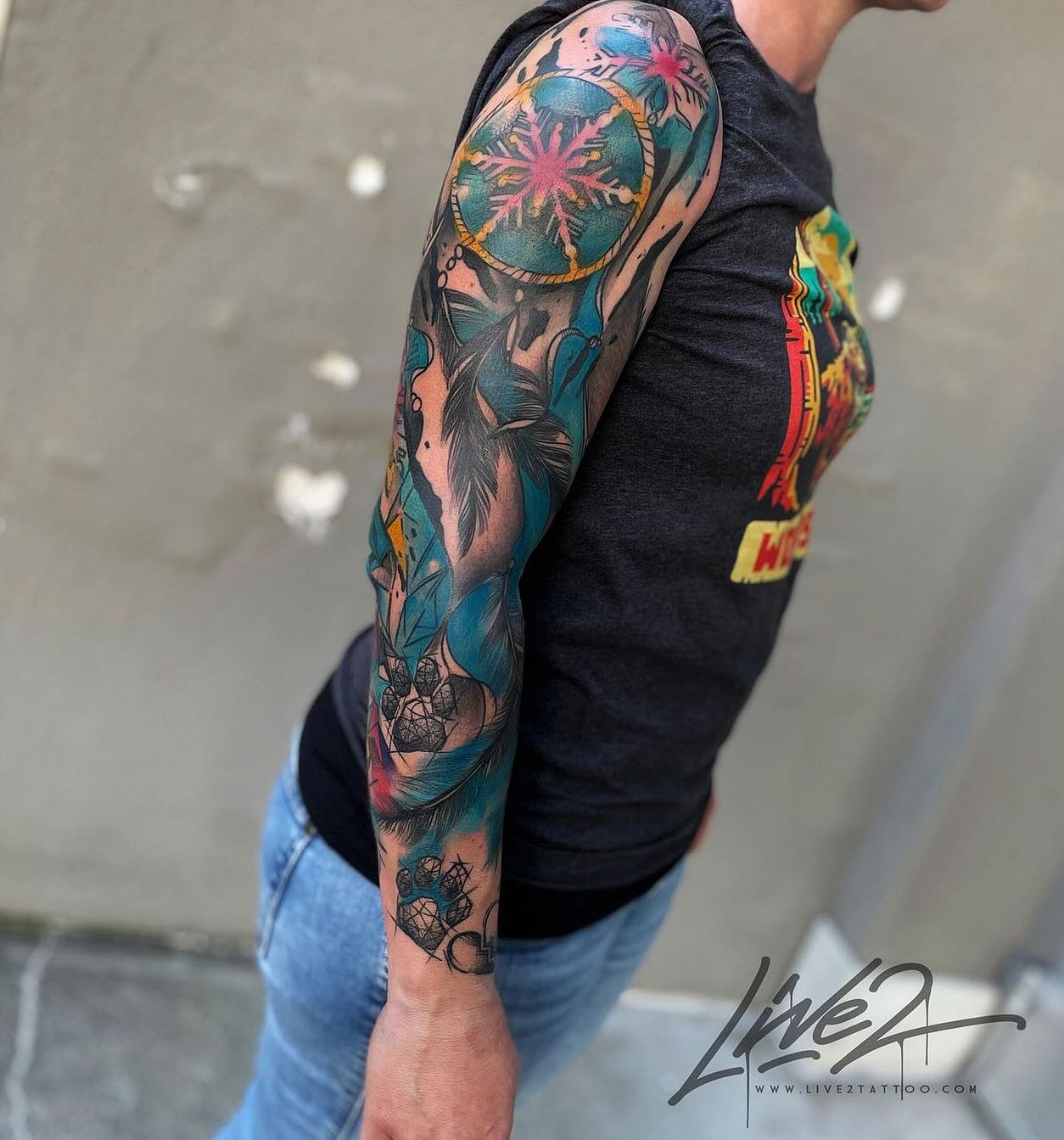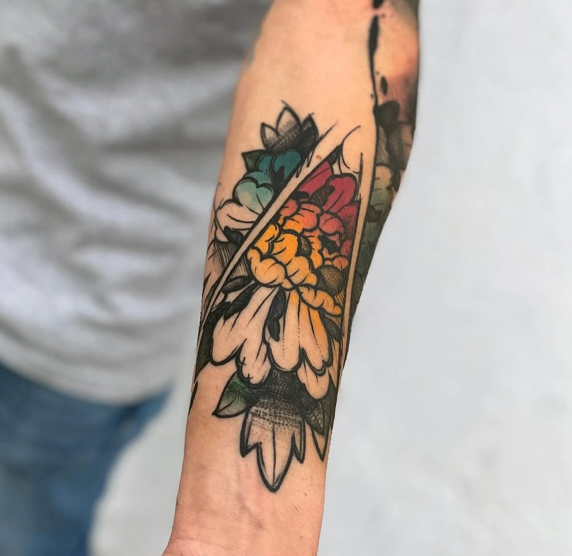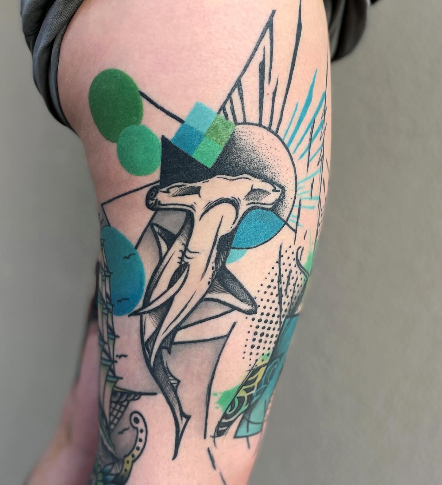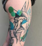 His relationship with Tattoo officially began in 2007, and his days as a graphic designer and graffiti artist are apparent throughout his work. His signature style combines graphic shapes, sketching technics, abstract forms, strict lines, graffiti textures and with an outstanding use of colour in a technique that resembles watercolour effect. The combination of these elements create a unique graphic abstract watercolor result.