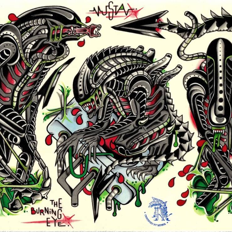 Rooted in Madrid, with a background in graffiti and graphic design, Musta honed his eye for strong silhouettes, simplified shapes, and high contrast storytelling that define him as a Traditional tattoo artist. His Modern Traditional tattoos emphasise bold linework, solid colour application, and clean, readable, long-lasting results. Influences span 1980s and 1990s sci-fi, Industrial Revolution era imagery, and contemporary art, all filtered through a graffiti-influenced, highly illustrative and folk-inflected lens. The work appears as custom designs: masks and beasts, rockets and robots, snakes, flowers, symbols, and folklore, distilled to their most striking form. He continues to paint custom flash to evolve these ideas.
