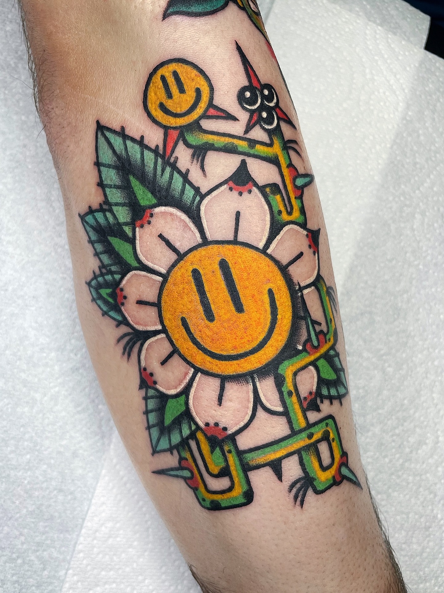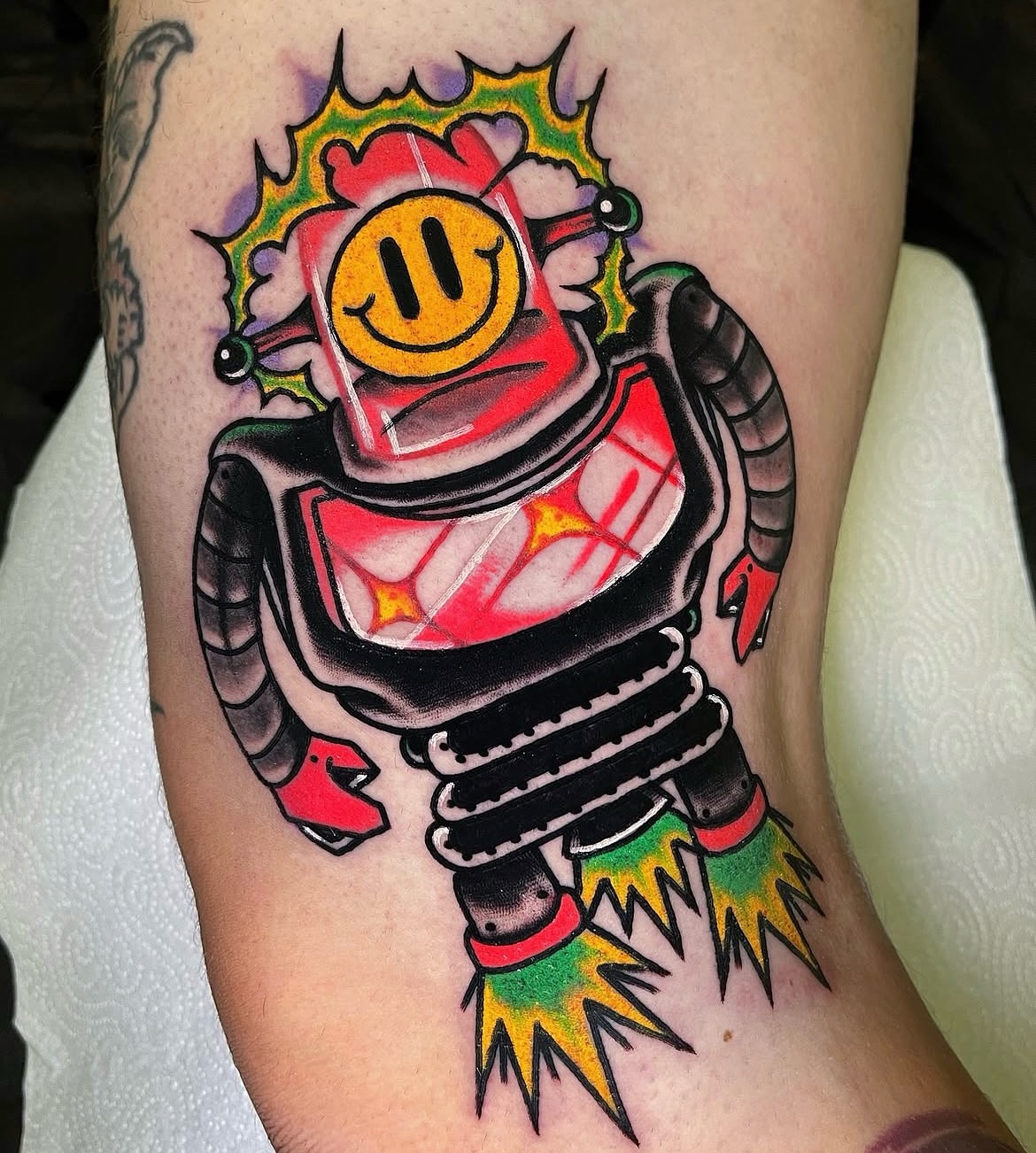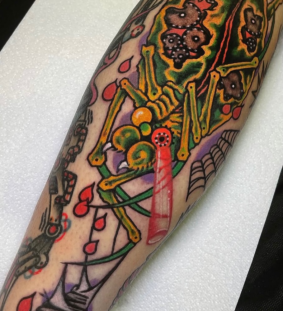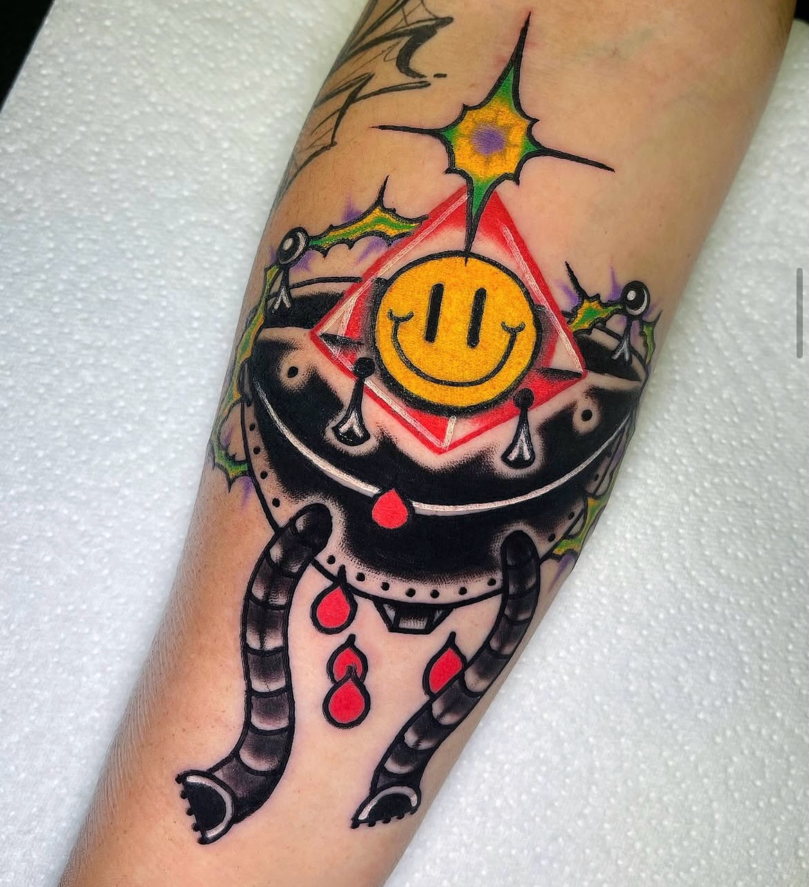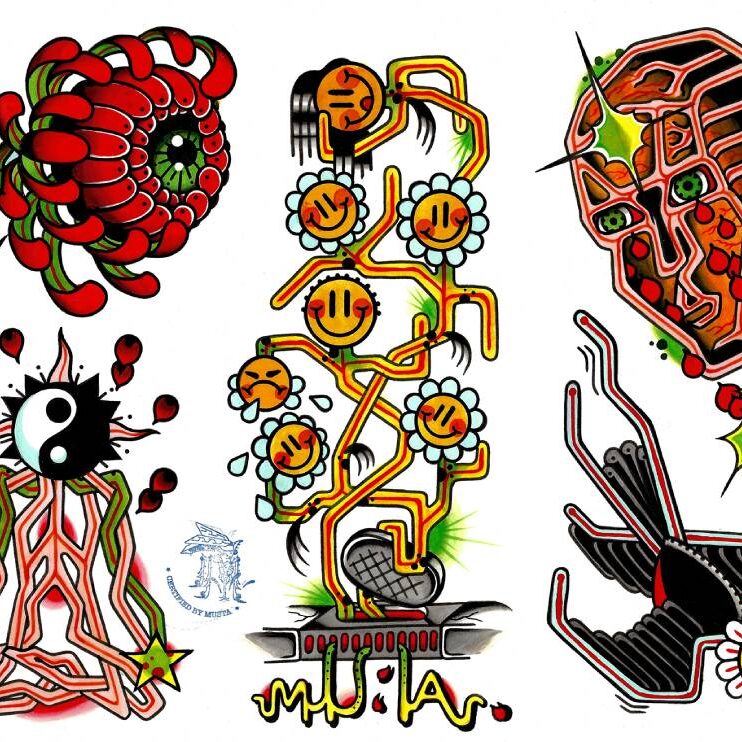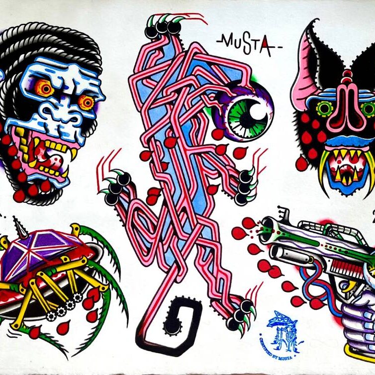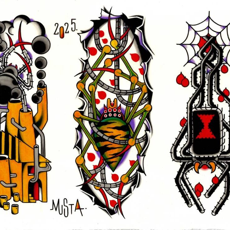 Rooted in Madrid, with a background in graffiti and graphic design, Musta honed his eye for strong silhouettes, simplified shapes, and high contrast storytelling that define him as a Traditional tattoo artist. His Modern Traditional tattoos emphasise bold linework, solid colour application, and clean, readable, long-lasting results. Influences span 1980s and 1990s sci-fi, Industrial Revolution era imagery, and contemporary art, all filtered through a graffiti-influenced, highly illustrative and folk-inflected lens. The work appears as custom designs: masks and beasts, rockets and robots, snakes, flowers, symbols, and folklore, distilled to their most striking form. He continues to paint custom flash to evolve these ideas.