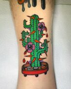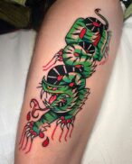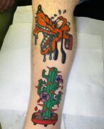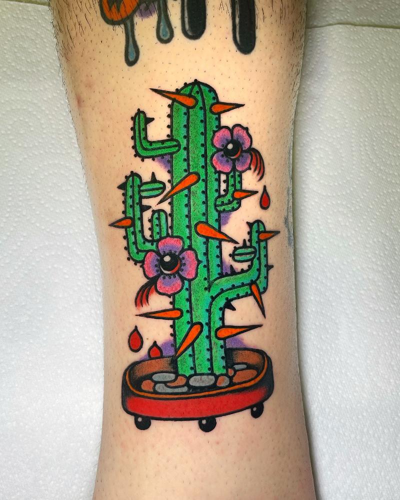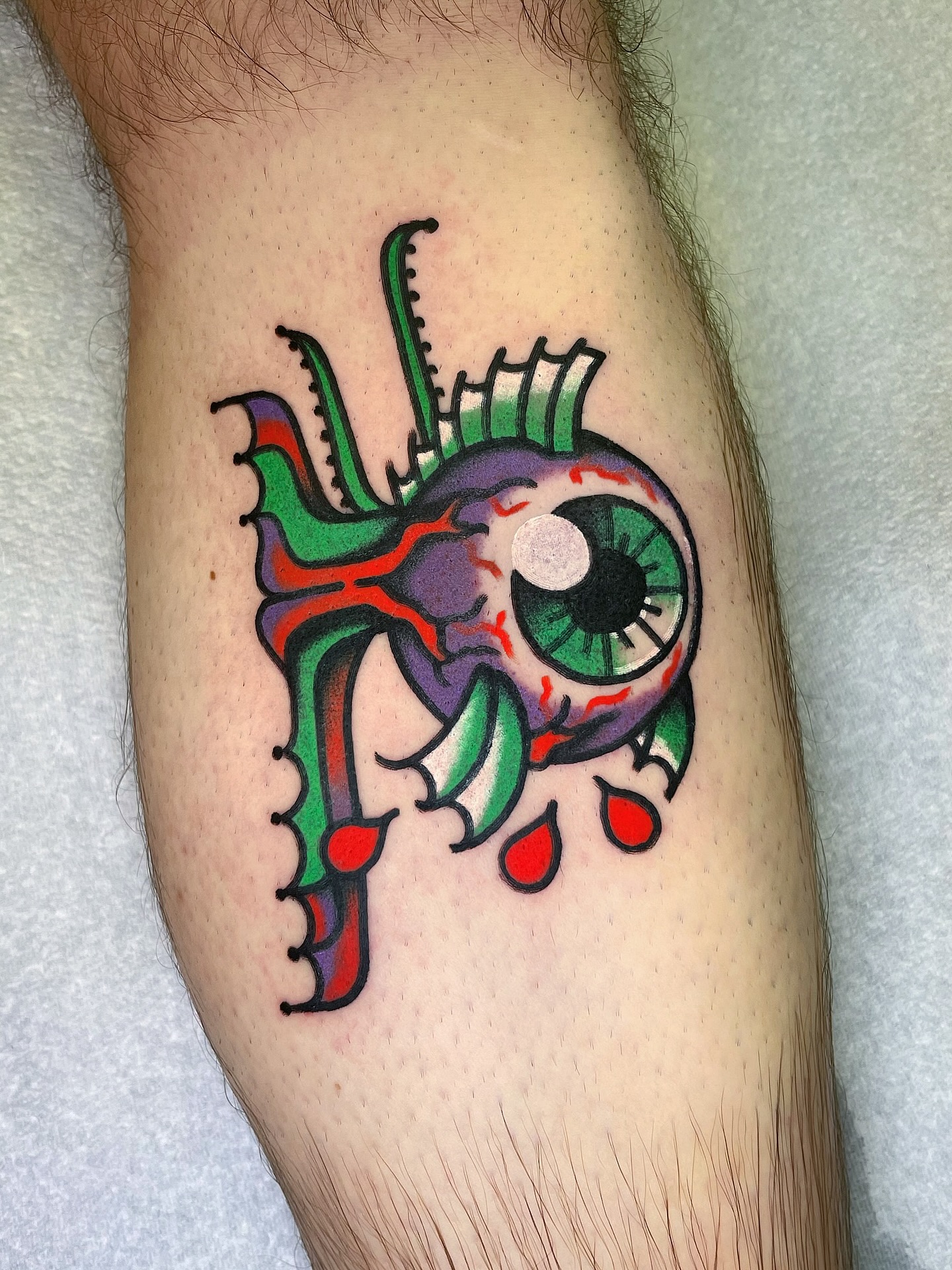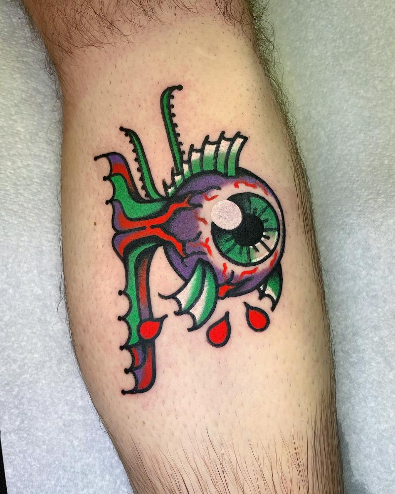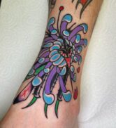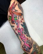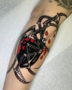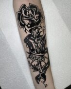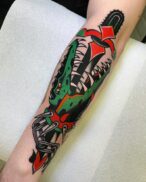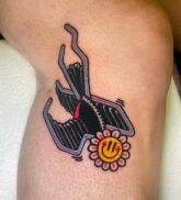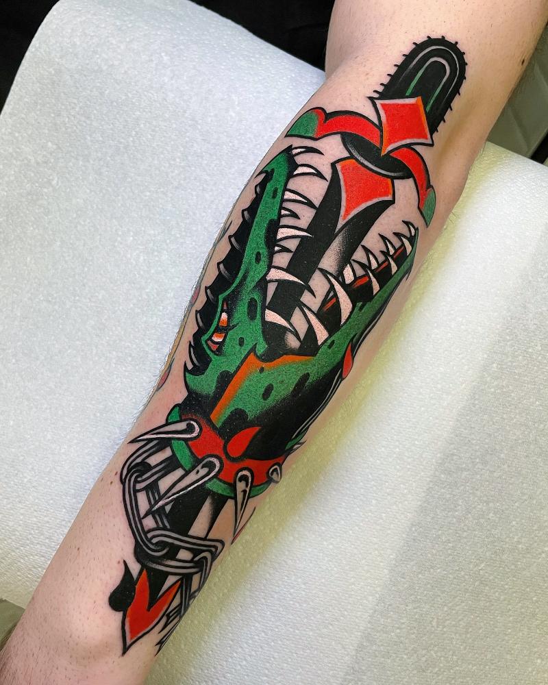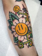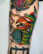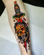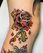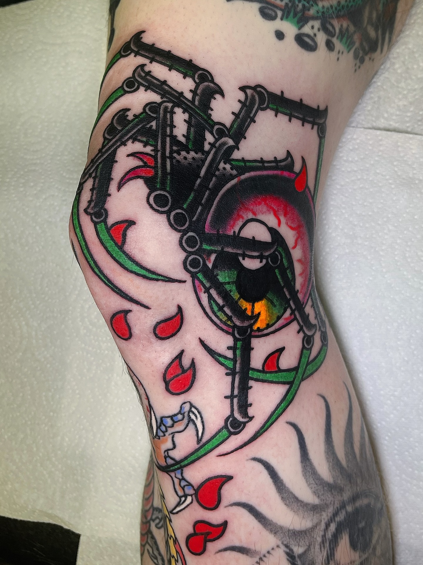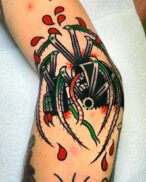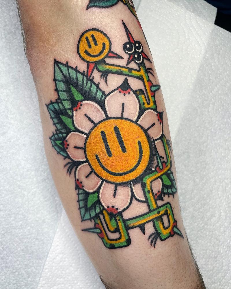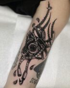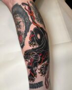 Rooted in Madrid, with a background in graffiti and graphic design, Musta honed his eye for strong silhouettes, simplified shapes, and high contrast storytelling that define him as a Traditional tattoo artist. His Modern Traditional tattoos emphasise bold linework, solid colour application, and clean, readable, long-lasting results. Influences span 1980s and 1990s sci-fi, Industrial Revolution era imagery, and contemporary art, all filtered through a graffiti-influenced, highly illustrative and folk-inflected lens. The work appears as custom designs: masks and beasts, rockets and robots, snakes, flowers, symbols, and folklore, distilled to their most striking form. He continues to paint custom flash to evolve these ideas.